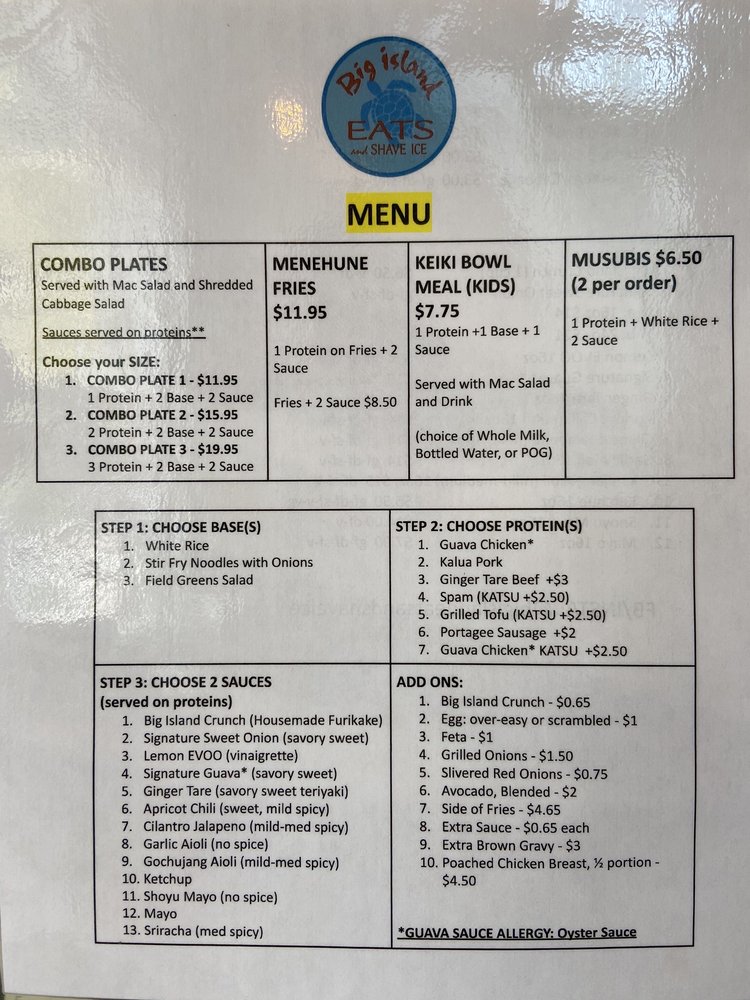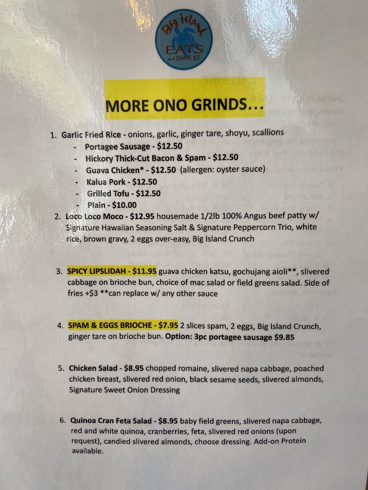 Welcome to Big Island Eats and Shave Ice, a delightful culinary escape nestled at 550 Deep Valley Dr, Rolling Hills Estates, CA. This charming spot is known for a vibrant menu that introduces a taste of Hawaiian comfort food. Highlights include the hearty Loco Moco ($13.95), savory Garlic Fried Rice, and refreshing salads like the Quinoa Cran Feta Salad ($9.95). For those seeking delightful snacks, try the signature Musubis ($7.25) or the crispy Menehune Fries ($13.95). The sweet finish awaits with their renowned shave ice, featuring luscious flavors like coconut and guava, topped with rich dark chocolate and vanilla ice cream. Customer favorites echo sentiments of warmth and originality, making it a hidden gem that promises memorable meals for families and lunch-goers alike. Whether it’s a quick bite or a catered celebration, Big Island Eats is your go-to for an authentic slice of Hawaiian flavor!